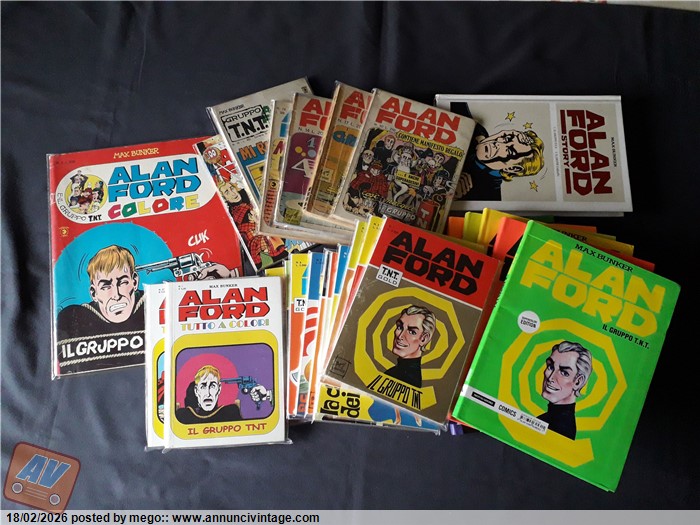 Vendo Lotto Alan Ford Albi di Varie Versioni: ---- Alan Ford Colore - Editoriale Corno Completo di Poster n.1 (Buono) piccole abrasioni, piccole pieghe ----- Alan Ford prima edizione - Editoriale Corno n.14 (Discreto) mancanze in costa/angolo prima pagina mancante, pieghe varie, No Adesivi n.17 (Discreto) segno di biro in ultima di copertina, pieghe varie, No Adesivi n.50 (Buono) NO Poster o Adesivi n.76 (Molto Buono) No Adesivi ------ Gruppo TNT Alan Ford - Editoriale Corno n.76 (Molto Buono) ------ Alan Ford - MPB Max Bunker n.300 (Ottimo) Completo di Adesivi ----- Alan Ford Tutto a Colori - MPB Max Bunker n.1 (Ottimo) n.27 (Ottimo) ----- Alan Ford SuperColor Edition - Mondadori Comics n.1/2/4/5/6/8/8/9/12 (Ottimi-Perfetti) ----- Alan Ford Gold - MPB Max Bunker da n.1 a n.10 (ottimi-Perfetti) ----- Alan Ford Story Cartonato - Mondadori n.1 (Ottimo) ----- Vendo Solo in Blocco - Non Divido ----- Prezzo riferito a tutto il Lotto. --------- Disponibile per qualsiasi chiarimento, foto o informazioni aggiuntive. ----------- Eventuali Spese di Spedizione da Concordarsi.